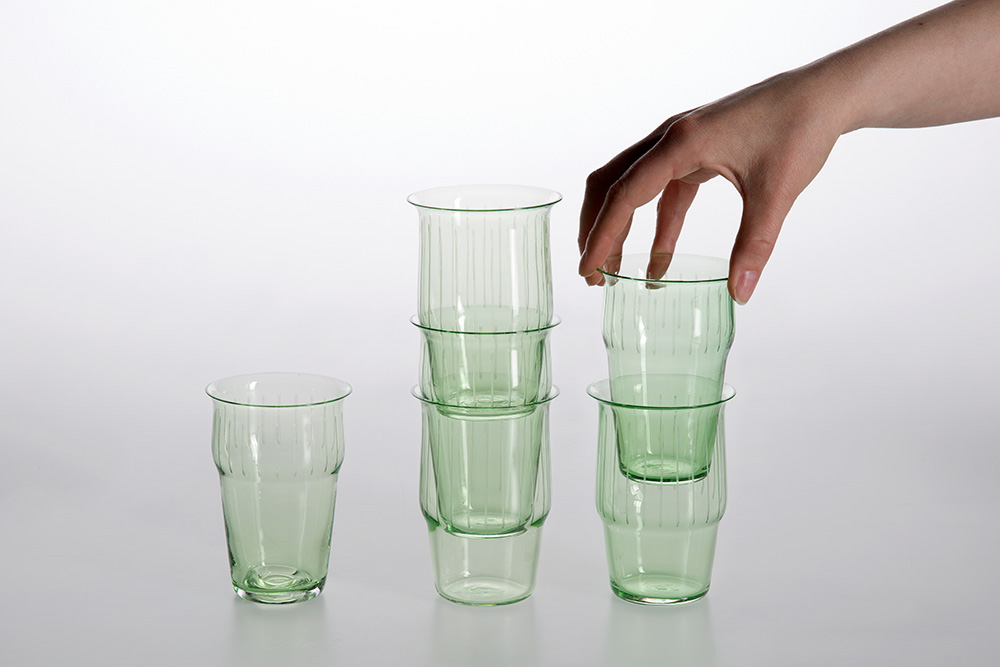 The stackable tumbler Skopen is a reference to the structure of the horsetail and inspired by the nature photography of Karl Blossfeldt. The natural individuality of each stem is taken into account through the design of two different tumbler shapes, which can be randomly assembled. The design is not alone an hommage to the botanical shapes in Bossfeldts photgraphs, but also to the flora as such, captured in a material as enduring and fragile as nature herself: glass.